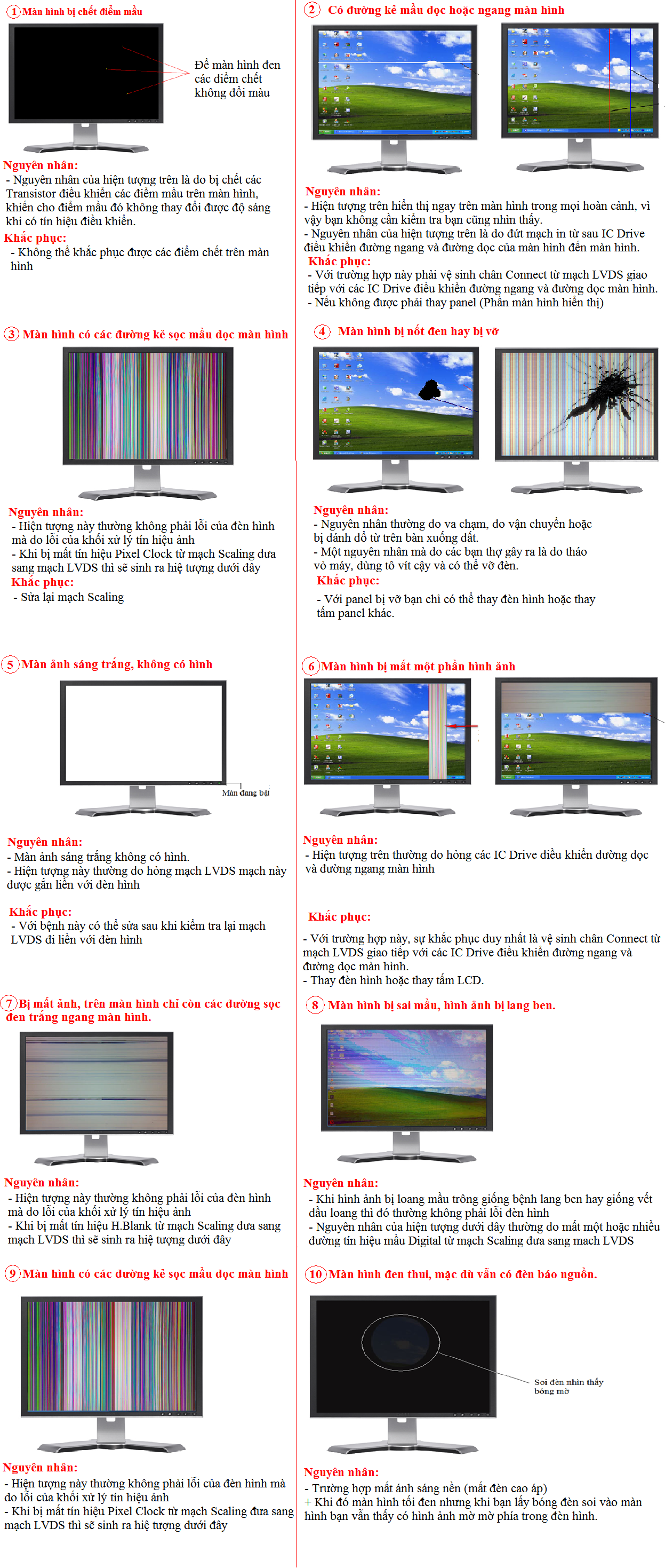 Quý khách hàng có thể tham khảo những lỗi màn hình máy tính hay gặp ở bên dưới và có phương án sửa chữa hoạc thay thế cho phù hợp, trường hợp xấu nhất khi không thể sửa được thì bắt buộc phải thay màn hình mới.